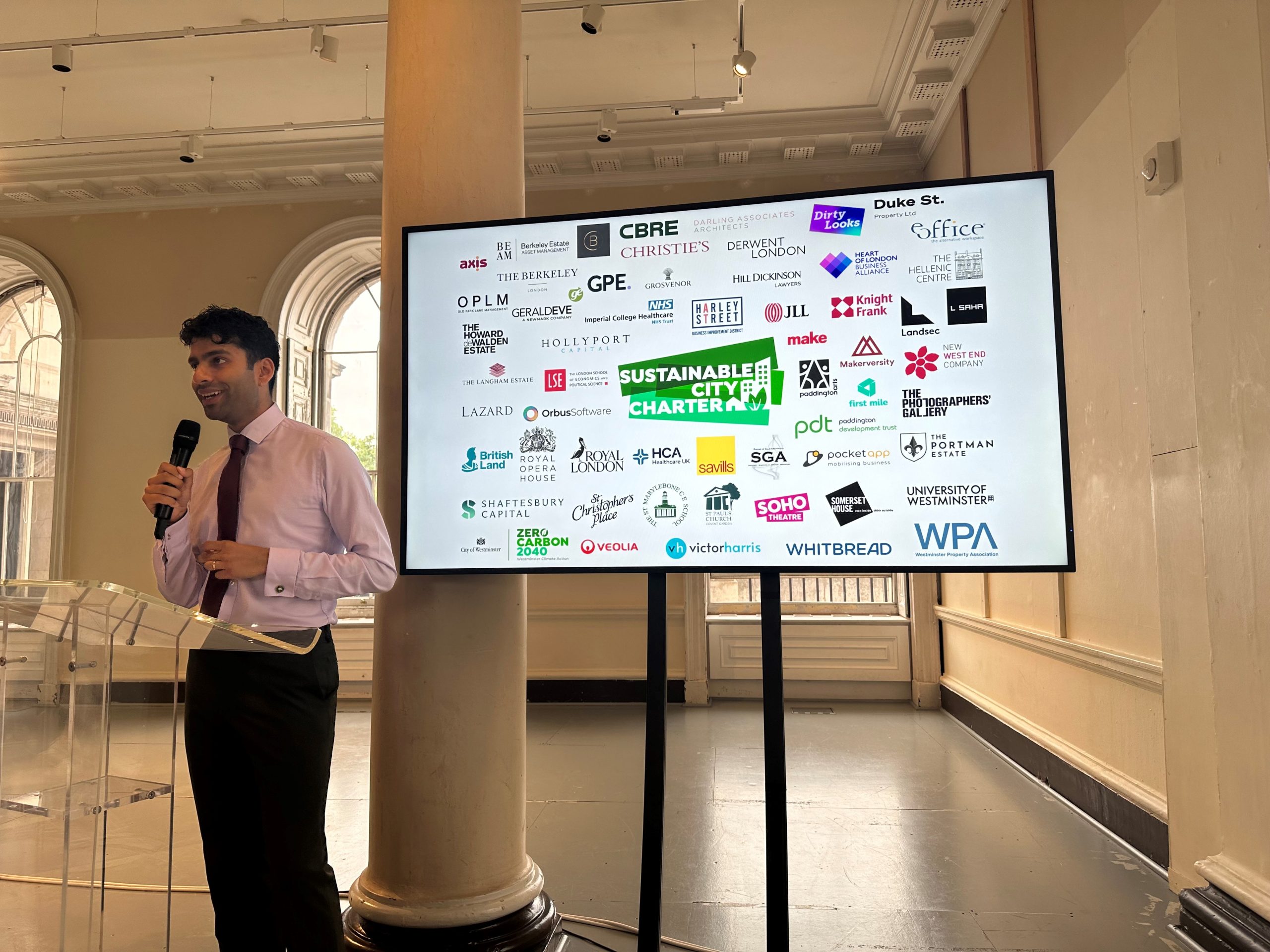 Hosted at Somerset House, Cllr Ryan Jude (Cabinet Member for Climate, Ecology and Culture, Westminster City Council) delivered the welcome to attendees. Alongside the Chair of the Sustainable City Charter Steering Group John Davies (Head of Sustainability, Derwent London) who moderated the panel session, our line-up of speakers included:
